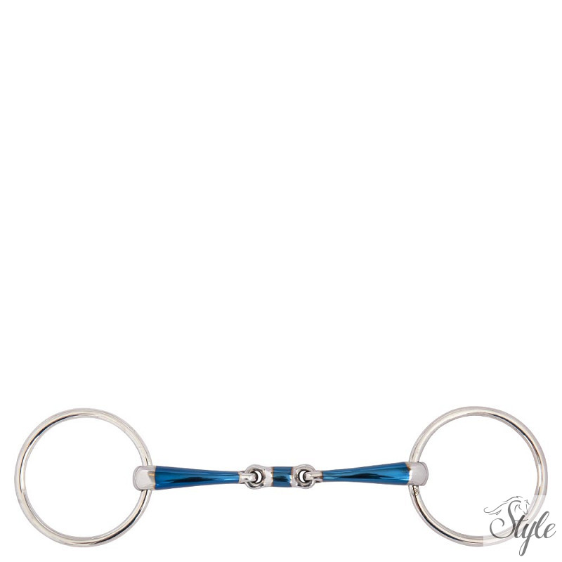Ez a dupla ízületű zabla tömör rozsdamentes acél gyűrűkből és puha acél szájrészből készül, édesvas bevonattal (kék). A szájrész édesvas bevonata serkenti a nyáltermelést. Amikor ez az anyag nedvességgel, hővel és levegővel reagál, oxidálódik, és édes ízű felületi rozsda képződik. Ez elősegíti a zabla elfogadását. A kék szín végül eltűnik, de a felületi rozsda íze megmarad.