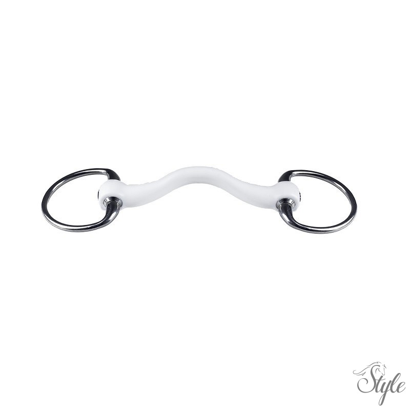 Ívelt szájrészes műanyag tömör zabla. Magas minőségű műanyagból készült zabla. Oliv karikákkal melyek nem rozsdásodnak.