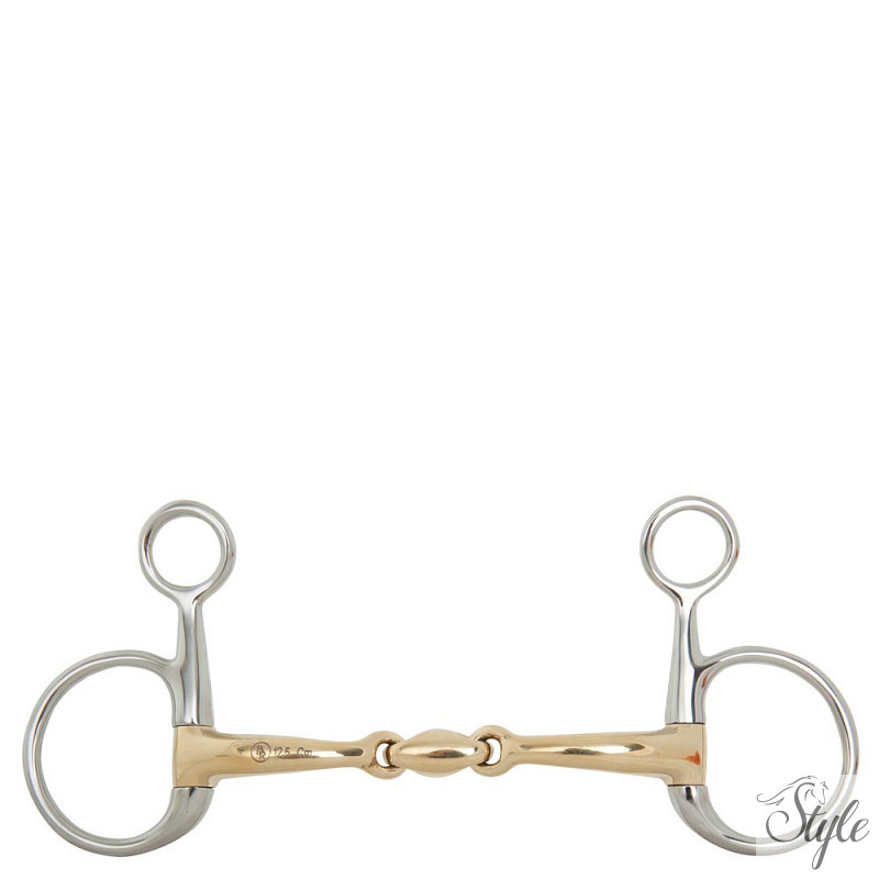 Ez a kiváló minőségű, dupla ízületű, függőpofa (más néven Baucher), felfelé nyúló gyűrűs karokkal, amelyek nyomást gyakorolnak, tömör Cupriganból készült, rozsdamentes acél gyűrűkkel. A Cuprigan egy ötvözet, amely 89% rézből, 7% alumíniumból, 3% vasból és 1% cinkből áll. Az anyag oxidációs folyamata kellemes illatot és ízt biztosít. A zabla anatómiai kialakítása követi a ló szájának formáját, ami lehetővé teszi a gyengéd és egyenletes nyomáseloszlást. A kialakítás a Cuprigan egyedi tulajdonságaival kombinálva elősegíti a rágási folyamatot és a nyáltermelést, ami kellemes kapcsolatot biztosít az érzékeny ló szájával. A gyűrűs karok enyhén kifelé fordulnak, ami optimális szabadságot biztosít a ló fejének.
