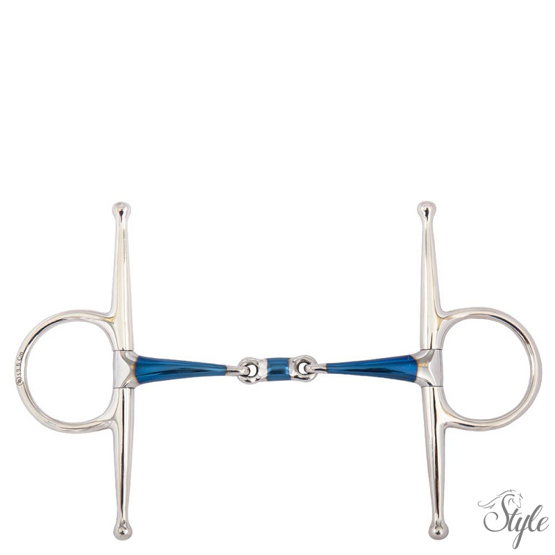 Ez a dupla ízületű, teljes pofa zabla tömör rozsdamentes acél gyűrűkből és puha acél szájrészből készül, édes vas bevonattal (kék). A szájrész édes vas bevonata serkenti a nyáltermelést. Amikor ez az anyag nedvességgel, hővel és levegővel reagál, oxidálódik, és édes ízű felületi rozsda alakul ki. Ez elősegíti a zabla elfogadását. A kék szín végül eltűnik, de a felületi rozsda íze megmarad.