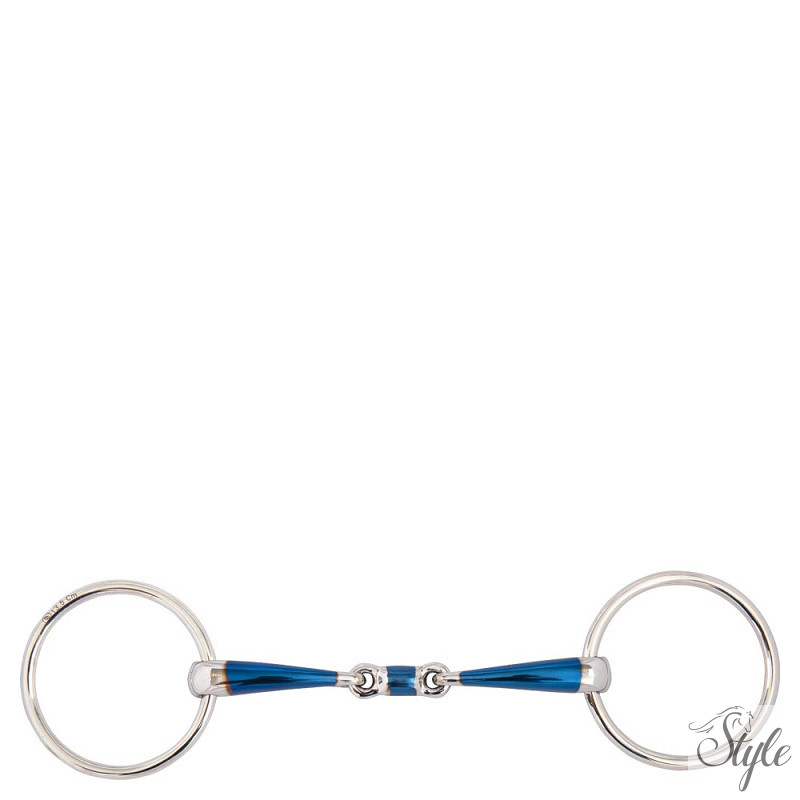 Ez a dupla ízületű zabla tömör rozsdamentes acélgyűrűkből és puha acél szájrészből készül, édes vas bevonattal (kék). A szájrész édes vas bevonata serkenti a nyáltermelést. Amikor ez az anyag nedvességgel, hővel és levegővel reagál, oxidálódik, és édes ízű felületi rozsda képződik. Ez elősegíti a zabla elfogadását. A kék szín végül eltűnik, de a felületi rozsda íze megmarad.