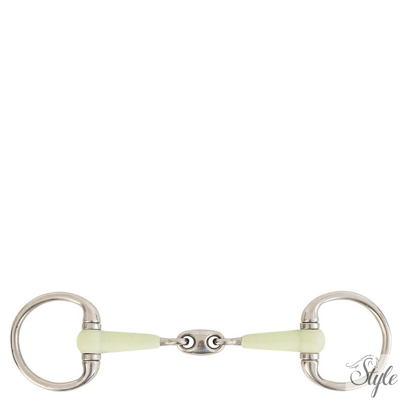 Ez a duplántört olivalakú zabla műanyag szájrészével, fém maggal és rozsdamentes acél gyűrűkkel rendelkezik. A rugalmas műanyag és a kiváló minőségű rozsdamentes acél kombinációjának köszönhetően a zablák stabilak, mégis kivételesen puhák és gyengédek. A műanyag 90A keménységű, és FDA által jóváhagyott. Ez azt jelenti, hogy az anyag oldószermentes, lágyítómentes és nem mérgező. Az anatómiai forma követi a ló szájának alakját, így gyengéd és egyenletes nyomáseloszlást hoz létre.