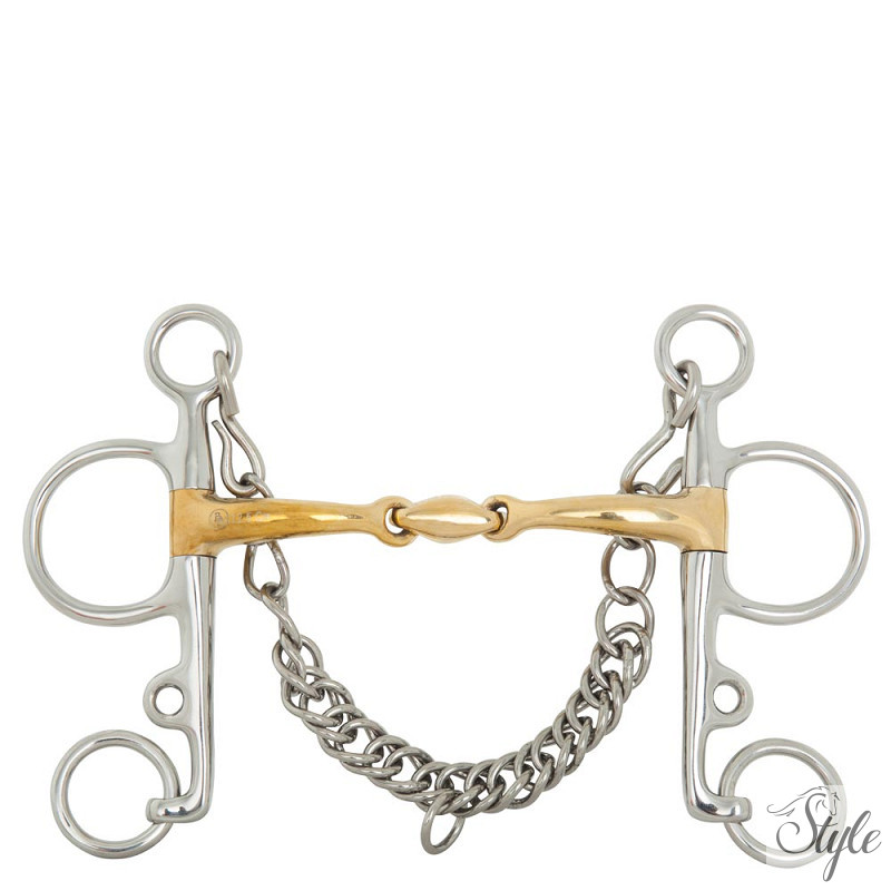 Ez a kiváló minőségű, duplántört Pelham zabla forgópofákkal és erőkarral, tömör Cupriganból készült, rozsdamentes acél gyűrűkkel. A Cuprigan egy ötvözet, amely 89% rézből, 7% alumíniumból, 3% vasból és 1% cinkből áll. Az anyag oxidációs folyamata kellemes illatot és ízt biztosít. A zabla anatómiai kialakítása követi a ló szájának formáját, ami lehetővé teszi a gyengéd és egyenletes nyomáseloszlást. A kialakítás a Cuprigan egyedi tulajdonságaival kombinálva elősegíti a rágási folyamatot és a nyáltermelést, ami kellemes kapcsolatot biztosít a ló érzékeny szájával. A gyűrűs felső szárak (szárszárak) enyhén kifelé fordulnak, ami optimális szabadságot biztosít a ló fejének. A zabla éles nyomást gyakorol a szájra. A szájrész vastagsága 16 mm, szárhossz 145 mm. Zablalánccal együtt.