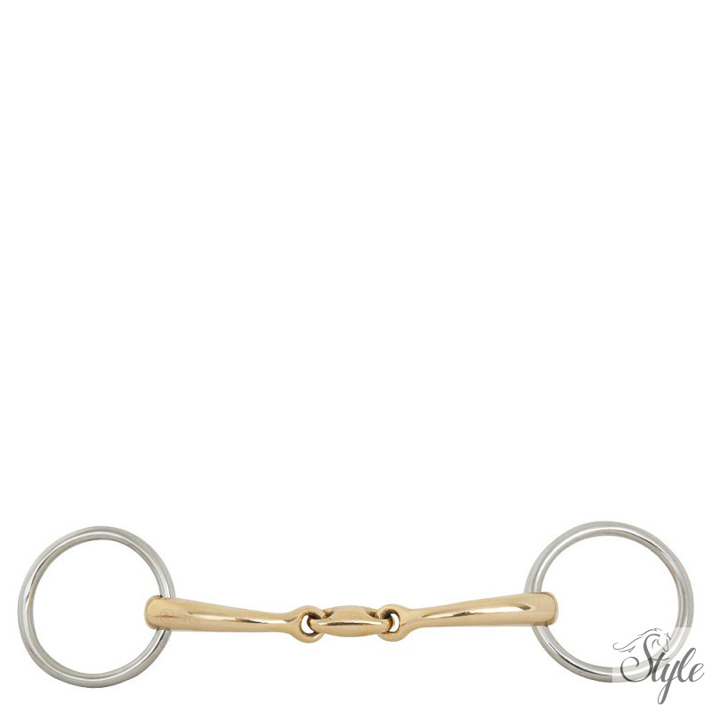 Ez a kiváló minőségű, duplántört zabla tömör Cuprigan anyagból készült, rozsdamentes acél gyűrűkkel. A Cuprigan egy ötvözet, amely 89% rézből, 7% alumíniumból, 3% vasból és 1% cinkből áll. Az anyag oxidációs folyamata kellemes illatot és ízt kölcsönöz neki. Az anatómiai forma követi a ló szájának formáját, így gyengéd és egyenletes nyomáseloszlást biztosít. A Cuprigan alakjának és egyedi összetételének kombinációja serkenti a rágási folyamatot és a nyáltermelést, kellemes kapcsolatot teremtve az érzékeny ló szájával. A zabla normálisan illeszkedik a szájra. A szájrész vastagsága 10 mm, a zablagyűrűk átmérője pedig 50 mm.