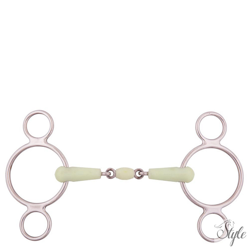 Pessoa duplántört, laza karikás zabla, 3 karikával, Apple Mouth szájrésszel és rozsdamentes acél karikákkal, 55 mm-es karikák 11,5 cm-hez és 65 mm-es karikák 12,5 cm-hez, 13,5 cm-hez és 14,5 cm-hez. Zabla vastagsága 18 mm.