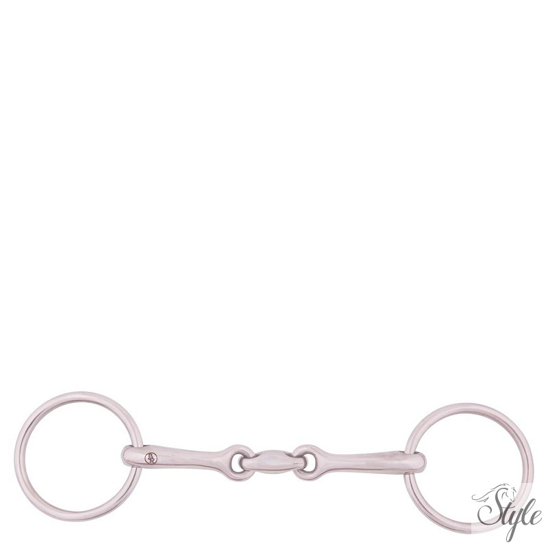 Duplántört zabla, tömör rozsdamentes acélból, 55 mm-es karikákkal. A szájrész vastagsága 13 mm.