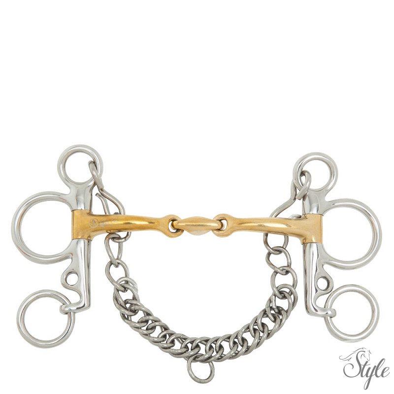 Ez a kiváló minőségű, duplántört Baby Pelham zabla forgópofákkal és erőkarral rendelkezik, tömör Cuprigan anyagból készült, rozsdamentes acél gyűrűkkel. A Cuprigan egy ötvözet, amely 89% rézből, 7% alumíniumból, 3% vasból és 1% cinkből áll. Az anyag oxidációs folyamata kellemes illatot és ízt biztosít. A zabla anatómiai kialakítása követi a ló szájának formáját, ami lehetővé teszi a gyengéd és egyenletes nyomáseloszlást. A kialakítás a Cuprigan egyedi tulajdonságaival kombinálva elősegíti a rágási folyamatot és a nyáltermelést, ami kellemes kapcsolatot biztosít a ló érzékeny szájával. A gyűrűs felső szárak (szárszárak) enyhén kifelé fordulnak, ami optimális szabadságot biztosít a ló fejének. A zabla éles nyomást gyakorol a szájra. A szájrész vastagsága 14 mm, szárhossz 102 mm. Zablalánccal együtt.