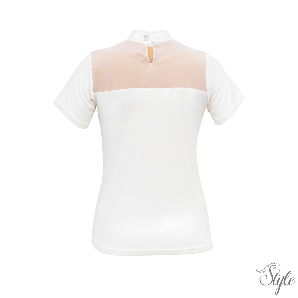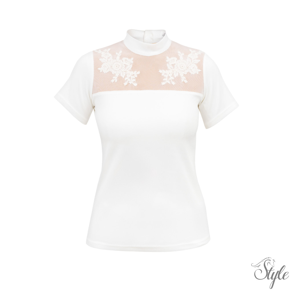 Fehér Mesh és Gyönyörű Csipke Rátétek: a funkcionális verseny toppot lenyűgöző versenyinggé emelik.