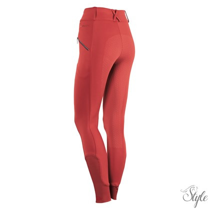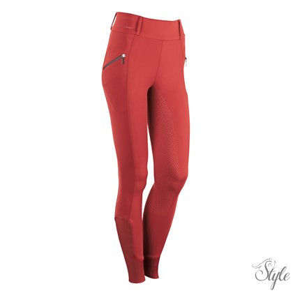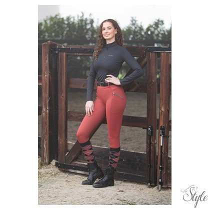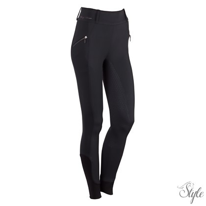Magas derekú lovaglóleggings övbújtatókkal, kövekkel dÍszítve. Két kövekkel díszített hasított zseb. A teljes ülés szilikonmintával készült a nyeregben való extra tapadás érdekében. A bokánál rugalmas nadrágvégek biztosítják a nagyobb kényelmet a lovaglócsizmában.