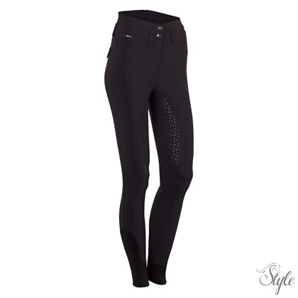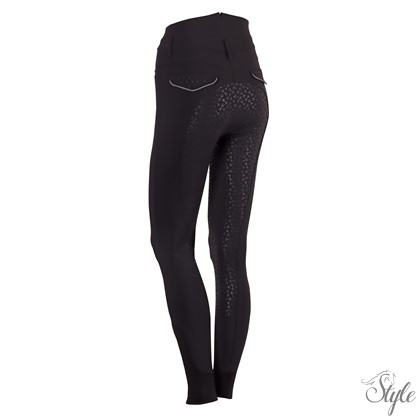 Lovaglónadrág magas derekú, elegáns V-kivágással hátul középen és övbújtatókkal. Hasított zsebek és díszes varrással és kövekkel díszített hátsó zsebek. Az ergonomikusan formázott teljes ülep szilikon zablamintával rendelkezik a nyeregben való extra tapadás érdekében. A bokánál rugalmas nadrágvégekkel nagyobb kényelmet biztosítanak a lovaglócsizmában.