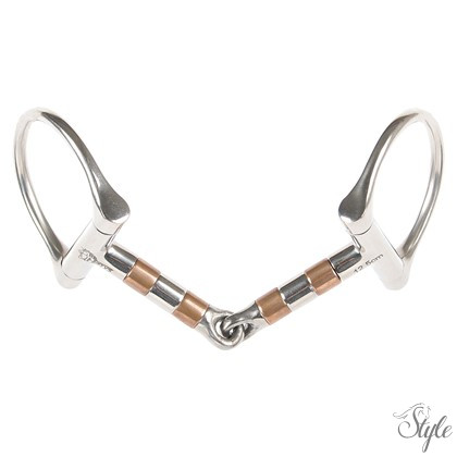 D-gyűrűs zabla rozsdamentes acélból, réz görgőkkel, 13 mm-es szájrésszel és 60 mm-es karikákkal.