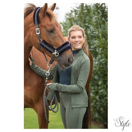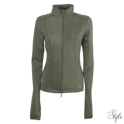 Sportos dzseki kétirányú cipzárral,kövekkel díszítve,cipzáros zsebekkel. Extra hosszú ujjakkal. Rugalmas és testhezállóanyagből készült.Márka logóval díszítve.