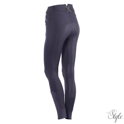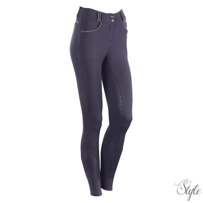 Lovaglónadrág két hasított zsebbel, csillámos szegéllyel és fegyverszürke kövekkel. Néhány övbújtató szintén csillámos szegéllyel rendelkezik. A teljes ülep szilikonmintával készült a nyeregben való extra tapadás érdekében. A boka körüli rugalmas nadrágvéggel nagyobb kényelmet biztosítanak a lovaglócsizmában.