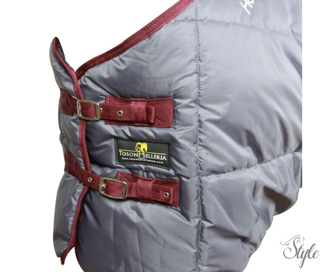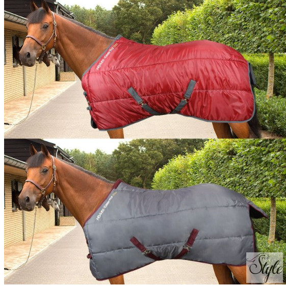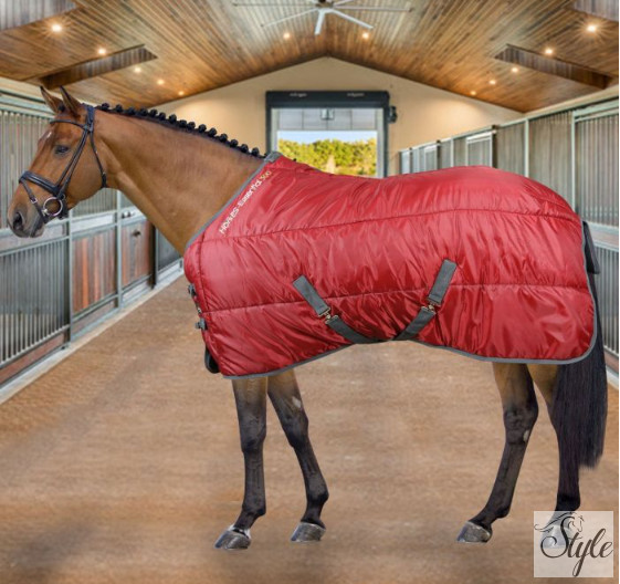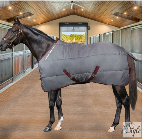 Keresztpántokkal, lábszár alatti pántokkal, farokvédővel és dupla elülső zárral felszerelve. Elegáns és egyszerű, a bal oldalon, a nyak közelében található "Horses Essential" hímzéssel, bordó vagy szürke kontrasztos szegéllyel.