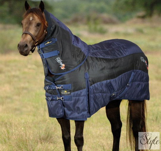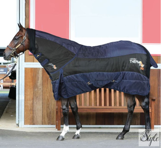 A nyak, a faroktakaró és a takaró hátulja polárral borított , súrlódásgátló hatással. Vállbetétekkel ellátva, hogy a ló lefeküdhessen anélkül, hogy a takaró zavarná . Az elülső zár dupla állítható csattal , karabínerekkel rendelkezik a gyors és egyszerű rögzítés érdekében. Keresztpántokkal és rugalmas lábpántokkal rendelkezik. 150 grammos / 1200D-os nyakvédővel , polár béléssel és gallérral kerül forgalomba, amelyet speciális tépőzáras pántokkal rögzítenek a takaróhoz.A Horses Thermo Hot elegáns kék / fekete színben kapható